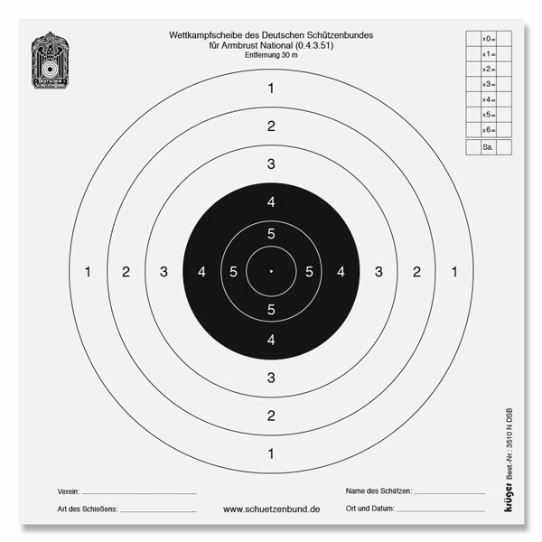 Armbrust 30 m national (6 Ringe) Scheibe mit DSB Signum; Wettkampfscheibe des...